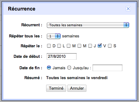 Tout d’abord, l’interface de répétition d’un évènement a été remaniée. Au lieu de prendre un bloc complet sur l’espace disponible, il suffit de cliquer sur la case à cocher “Récurrence”. Cette action fait apparaître un éditeur permettant de spécifier les paramètres de l’évènement dont on veut gérer la répétition (Date de début et fin, récurrence, …).