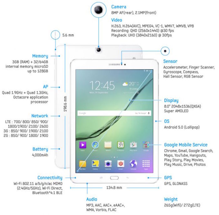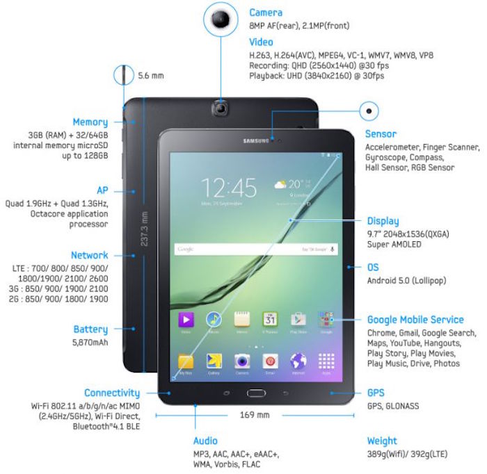 La Galaxy Tab S2 9.7 mesure 169 x 237.3 x 5.6 mm, et pèse 389 g pour le modèle Wi-fi. La variante LTE n’est pas beaucoup plus lourde, avec un poids de 392 g relevé sur la balance. Quant à sa petite soeur, la nouvelle Galaxy Tab S2 8.0, elle mesure 134.8 x 198.6 x 5.6 mm avec un poids de 265 g pour le modèle Wi-fi, et 272 g pour le modèle LTE.