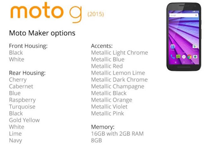 Pourtant, selon une page qui a été brièvement visible sur le site Web de la société, le Moto G (2015) pourra être personnalisé avec l’outil Web Moto Maker. Il s’agirait d’une première pour ce dispositif. Les options comprennent une façade avant en noire ou blanche, des coques arrière en 10 coloris différents, et un choix de couleurs parmi lesquels on a du bleu, du rouge et sept de plus. Avec Moto Maker, vous serez également en mesure de choisir le fond d’écran qui sera chargé la première fois que vous allumerez le smartphone, et pour 30 euros de plus, vous pouvez opter pour une coque Flip Shell.