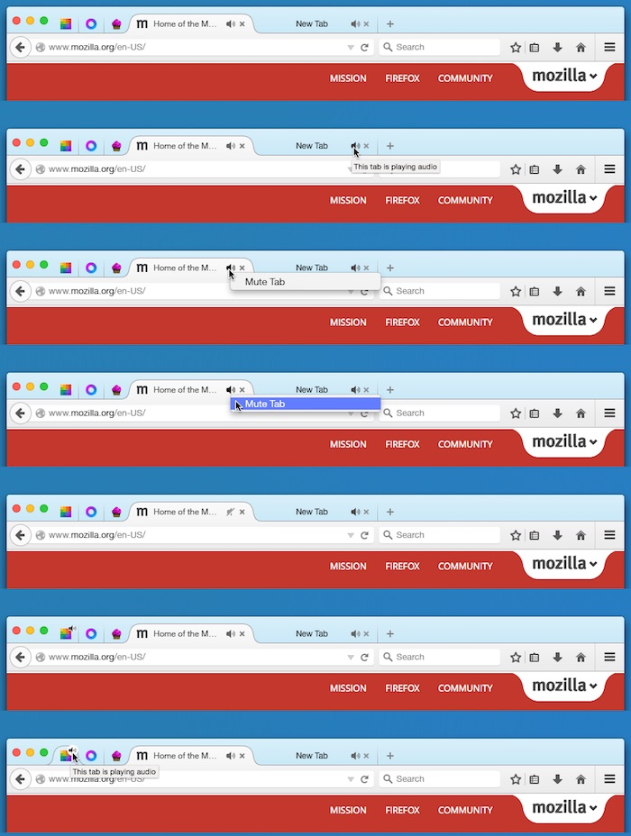 Bien que cette fonctionnalité soit disponible pour les utilisateurs de Firefox par un add-on ou une extension sur le navigateur, la demande pour qu’elle soit intégrée dans le navigateur a persisté. Chrome a des icônes sur ses onglets émettant un son, mais ne permet pas aux utilisateurs de couper par défaut le son de ces onglets. Safari a des indicateurs audio et fourni aux utilisateurs la possibilité de désactiver le son de ces onglets.