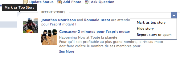 Si vous êtes un visiteur régulier de Facebook, la mise à jour de votre fil d’actualité sera faite avec un contenu plus récent et ce, dans l’ordre chronologique. Vous avez également la possibilité de marquer une actualité comme “Top Story”, entendez par là “À la une”. Pour se faire, vous aurez deux possibilités : soit depuis le petit coin en haut à gauche de la publication, soit en cliquant sur la petite flèche qui apparaît lors du survol de la publication et en cliquant sur “Mark as top story”.