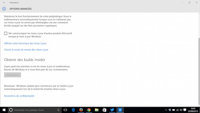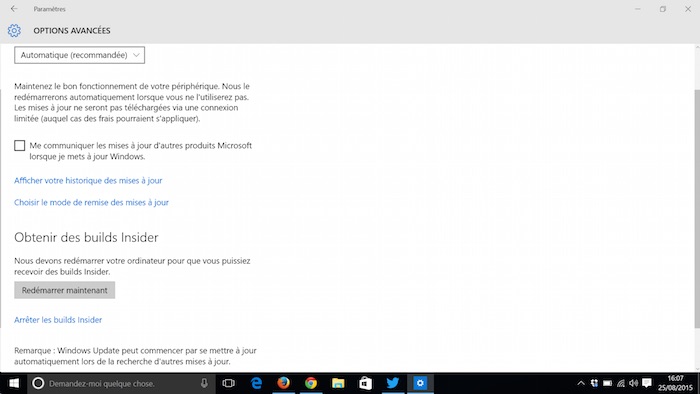 Pour cesser de recevoir les builds Insider, vous pouvez simplement visiter la page “Options avancées”, à nouveau dans les paramètres de Windows Update, et cliquez sur “Arrêter les builds Insider”. Vous serez remercié pour votre participation et votre ordinateur va redémarrer. Sachez néanmoins que vous n’avez pas réellement quitter le programme Insider avec votre compte Microsoft.