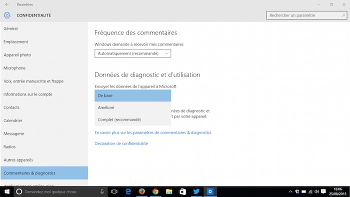Le bouton “Commencer” est grisé ? Allez dans “Paramètres”, puis “Confidentialité” et “Commentaires et diagnostics” et veillez à ce que “Données de diagnostic et d’utilisation” soit positionné sur soit “Complet (recommandé)” ou “Amélioré”. Si le menu est réglé sur “De base”, vous ne serez pas en mesure d’activer et utiliser les builds Insider. Microsoft veut recevoir les informations de diagnostic si vous utilisez des pré-versions de Windows 10.
