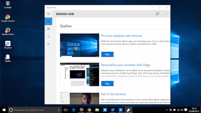 Après l’avoir fait, l’application Insider Hub va apparaître dans votre liste “Toutes les applications”. Vous allez pouvoir effectuer une variété de “quêtes” qui demandent de tester des choses dans Windows 10, visualiser des clips sur les changements, les problèmes que vous pouvez rencontrer avec la nouvelle build, ou encore des informations sur votre profil Insider.