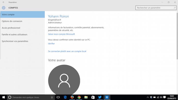 Tout d’abord, assurez-vous de vous connectez à votre PC avec un compte Microsoft. Si ce n’est pas le cas, vous pouvez aller dans les “Paramètres”, sélectionnez “Comptes” dans le volet de gauche, et utilisez l’option pour convertir votre compte d’utilisateur local à un compte Microsoft.
