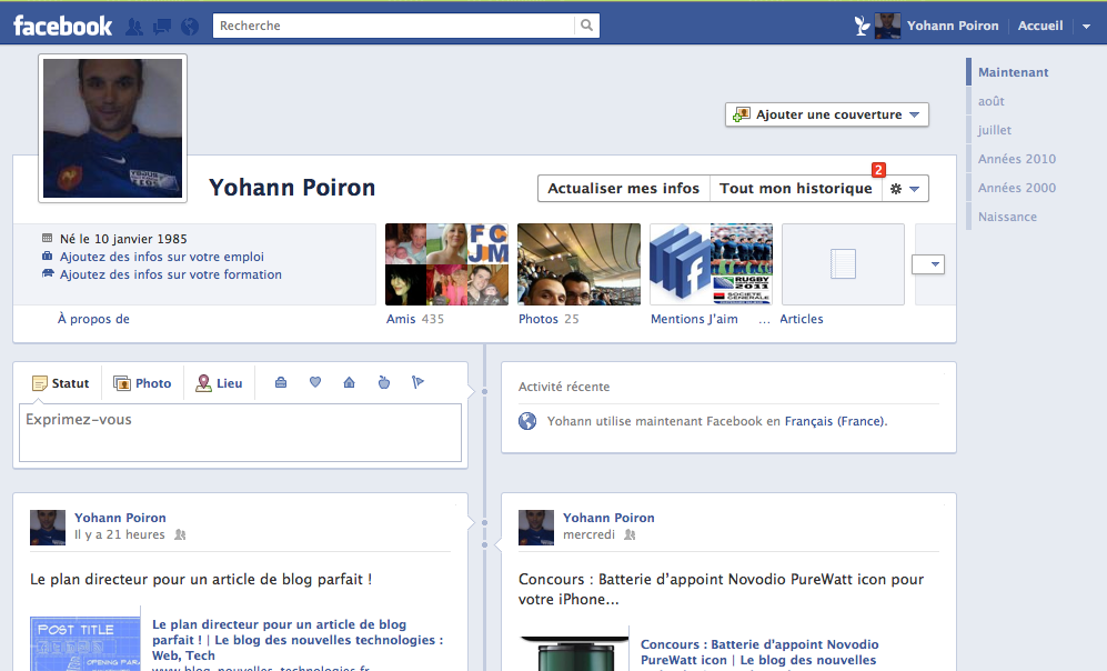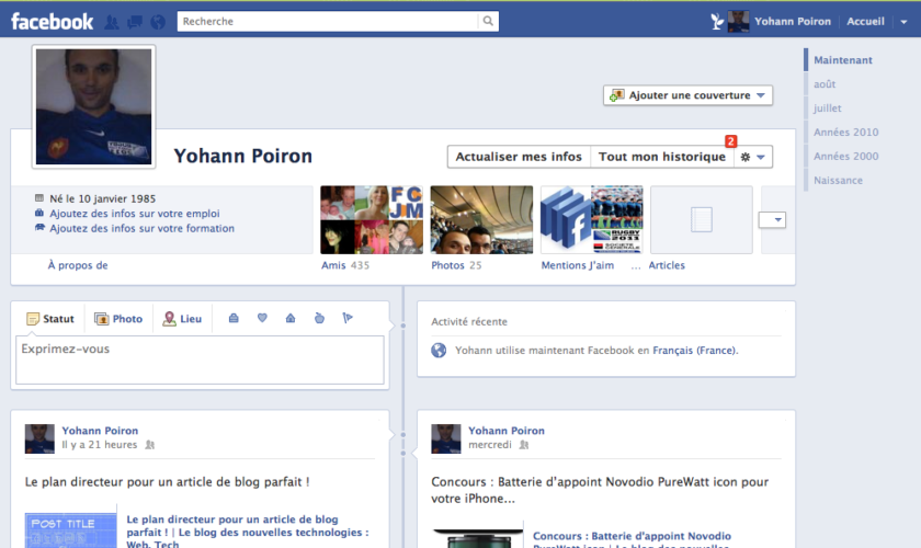 La “Timeline” quant à elle est très déstabilisante, tout simplement parce que l’on perd tous ses repères. Il est difficile de traduire la vision que l’on avait de son mur Facebook dans cette nouvelle organisation, mais je suppose que c’est une question d’habitude ! Dans 3 mois tout le monde se rappellera des anciens profils, et cela fera sourire !