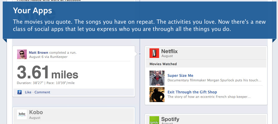 Après avoir terminé son explication sur la timeline, Facebook a parlé des applications. Celles-ci interagissent avec la timeline et ce, de manières importantes. Elles peuvent être ajoutées à votre propre timeline, et enlevées aussi facilement, de sorte que vous puissiez afficher les informations que vous pensez pertinentes et mettre en valeur vos “histoires personnelles”.