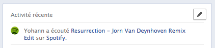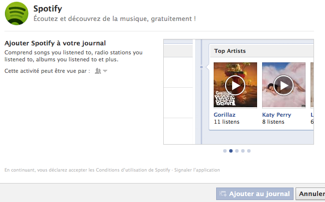 Le nouveau protocole Open Graph se concentre sur deux choses : enrichir votre profil et faire découvrir de nouvelles choses à vos amis. Les applications peuvent maintenant publier au fil des eaux des informations, avec une obligation de ne pas inciter les utilisateurs. Cela va permettre d’avoir une légère activité au niveau du Ticker. Cela nécessite évidemment un nouveau mode de permissions, qu’a mis en place Facebook. La page d’autorisations pour Spotify ressemble à ceci :