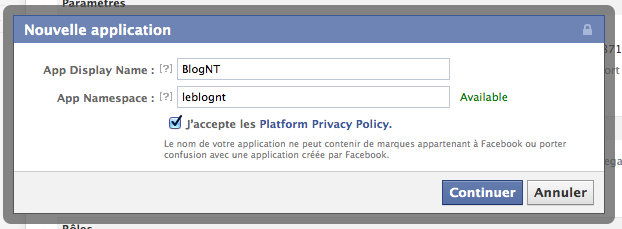 - 4 – Créez une nouvelle application. Donnez à votre application flambant neuf un nom et un namespace comme bon vous semble. Lisez et acceptez l’accord de confidentialité de la plateforme. C’est l’étape indispensable pour être vérifié.