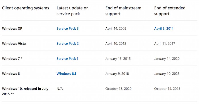 Microsoft a mis à jour sa fiche d’information du cycle de vie de Windows, avec des dates de fin de support pour Windows 10. La société affirme que le support principal pour le système d’exploitation Windows 10 prendra fin le 13 octobre 2020, et le support étendu se terminera quant à lui le 14 octobre 2025. Cela a du sens, puisque Microsoft fournit généralement un support principal à 5 ans après la libération d’un système d’exploitation, et support étendu pendant environ 10 ans.
