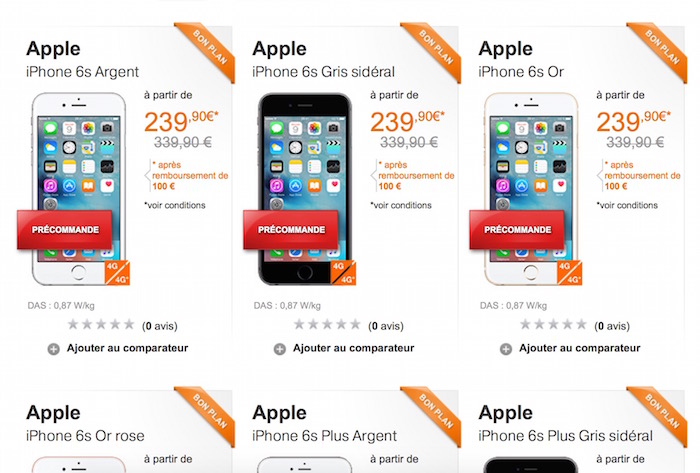 - iPhone 6s 64 Go (Argent, Gris sidéral, Or, Or rose) : 859 euros