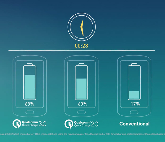 Qualcomm a dévoilé la prochaine génération de sa technologie de charge rapide qui vous permet de recharger votre smartphone ou la batterie de votre tablette très rapidement. La société affirme que la technologie Quick Charge 3.0 vous permettra de recharger une batterie de smartphone à 80% en 35 minutes environ, en partant d’une batterie qui est presque à plat.