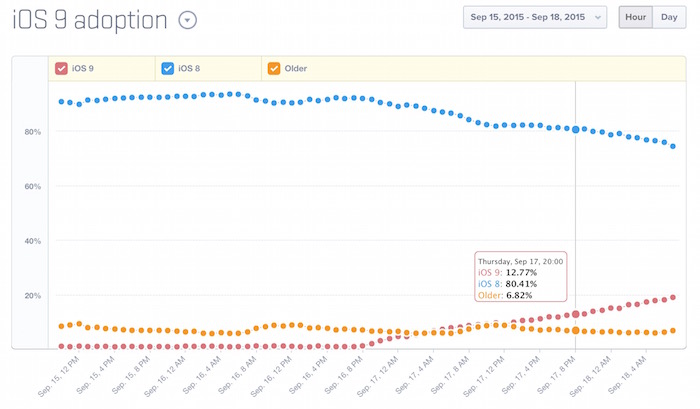 La société a mis en exergue qu’iOS 9 a connu un taux d’adoption de 12% en moins de 24 heures après avoir été libéré, ce qui est plus rapide que la croissance d’iOS 8, déclare le PDG de Mixpanel, Suhail Doshi. Deux fois plus rapide, pour être exact. On peut légitimement penser que ce succès est en partie dû à une version bêta libérée en amont de la version finale, incitant les utilisateurs à passer à iOS 9 pour ses dernières fonctionnalités.