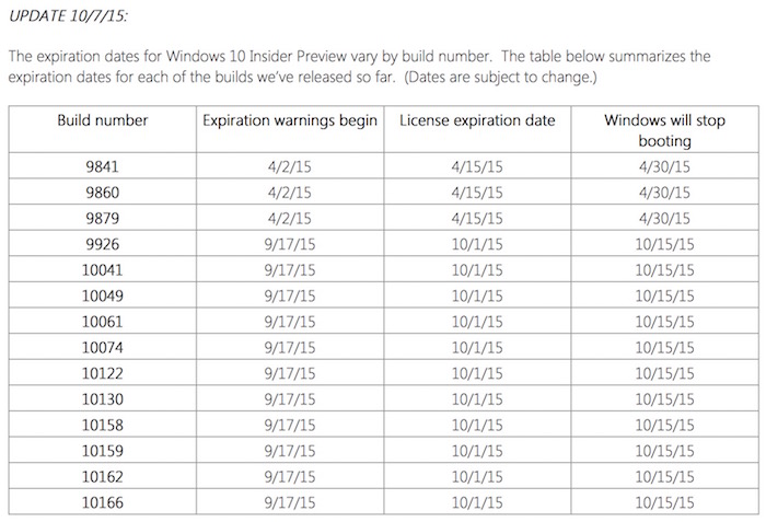 Microsoft avertit les utilisateurs que dans quelques jours, les builds Insider Preview publiées entre le 23 janvier et le 9 juillet vont expirer. Et dès lors que ce couperet va tomber, Windows 10 ne démarre pas. Ces versions sont numérotées de 9826 à 10166. La build 10166 est la dernière Insider Preview poussée avant le lancement de Windows 10 RTM.