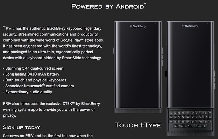 Si nous avions déjà eu beaucoup d’informations sur ce smartphone grâce à une série de fuites, le PDG de la société a en personne révélé son identité et discuté de ce smartphone, qui pourrait relancer la firme canadienne sur un secteur où elle est en déclin. Mais aujourd’hui, BlackBerry a même lancé une page d’inscription pour le prochain smartphone BlackBerry Priv. Par celle-ci, la société confirme quelques détails clés, et promet de délivrer le smartphone dès son annonce.