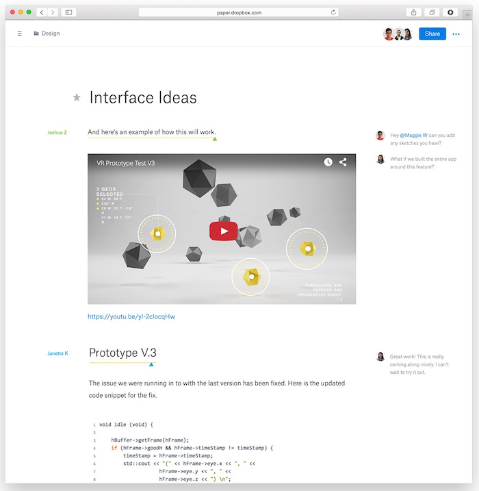 Par exemple, si vous deviez commencer à développer votre site Web dans un document, Paper pourrait automatiquement le formater en fonction du langage utilisé – HTML, CSS, etc. Au-delà du texte, les utilisateurs peuvent insérer des images, du code, des tableaux et ajouter des mentions (“@”) dans le but d’identifier qui doit achever certaines tâches pour clôturer le document.