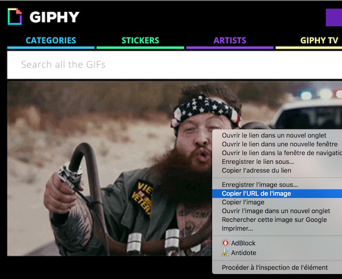 L’affichage d’un GIF est simple. Cependant, vous ne serez pas autorisé à télécharger vos propres fichiers GIF à votre publication comme vous le feriez avec une photo. Vous devrez soit en créer un et le transférer sur un site d’hébergement, ou tout simplement trouver un GIF qui décrit, par exemple, votre blues du lundi matin, à partir de sites comme Giphy, Imgur et Tumblr. Ouvrez le GIF, et réalisez un clic droit sur l’image.