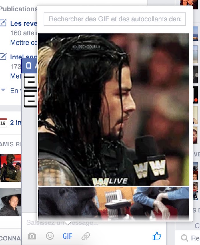 Vous pouvez aussi avoir remarqué une option GIF dans vos discussions Messenger, et partager des images animées lors de vos discussions. Facebook teste encore l’ajout du bouton GIF dans Messenger, et il est possible que cette option ne soit pas encore disponible sur votre compte. Ouvrez une fenêtre de chat sur le site Facebook ou depuis l’application Messenger et vous devriez retrouver un nouveau bouton GIF à côté de l’icône des smileys.