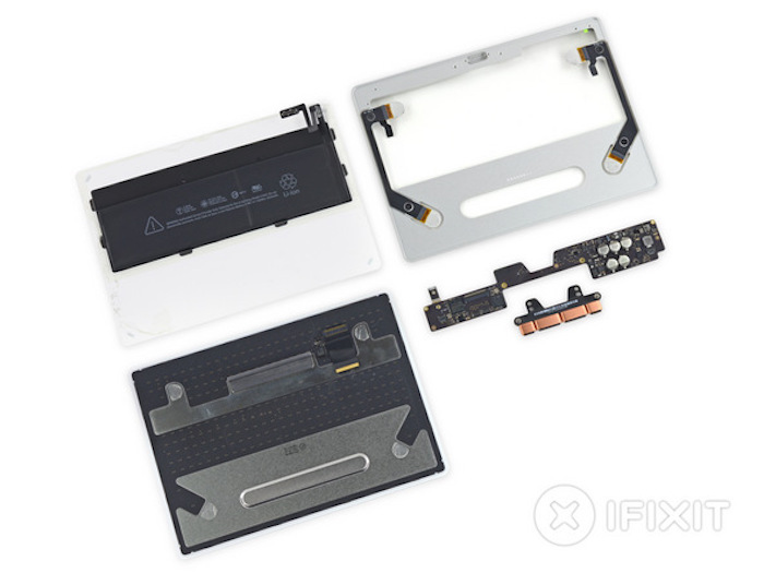 Concernant le Magic Trackpad 2, en matière de réparabilité, il fait un peu mieux puisque celui-ci obtient la note de 3 sur 10. Ces quatre parties cuivrées concernent le Taptic Engine, qui simule chaque action, chaque notification, sans l’aide des boutons physiques. À l’intérieur, une batterie lithium-ion-polymère d’une capacité de 2 024 mAh alimente le Magic Trackpad 2, qui s’avère être plus grande que celle de l’iPhone 6s, mais plus petite que celle de l’iPhone 6s Plus. Évidemment, le score de réparabilité est faible en raison d’un manque de manuels de réparation, d’une utilisation excessive de colle où des vis suffiraient, et la difficulté générale du démontage.