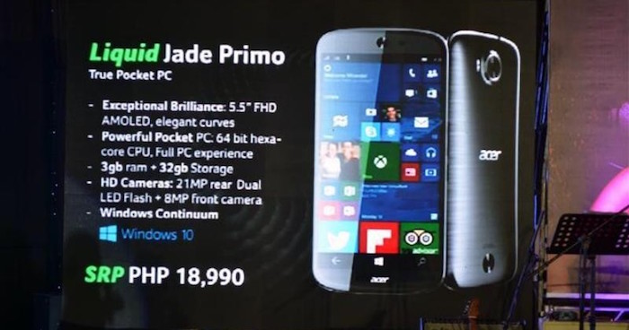 Le Acer Jade Primo est un smartphone conçu pour exécuter le tout dernier système d’exploitation de Microsoft, Windows 10 Mobile. Évidemment, il s’agira de la version mobile de l’OS. Il est également l’un des premiers smartphones qui sont prévus d’offrir un support à Continuum de Microsoft. Ce dernier vous permet une fois qu’un clavier, une souris et un écran sont connectés d’utiliser votre smartphone comme un ordinateur de bureau.