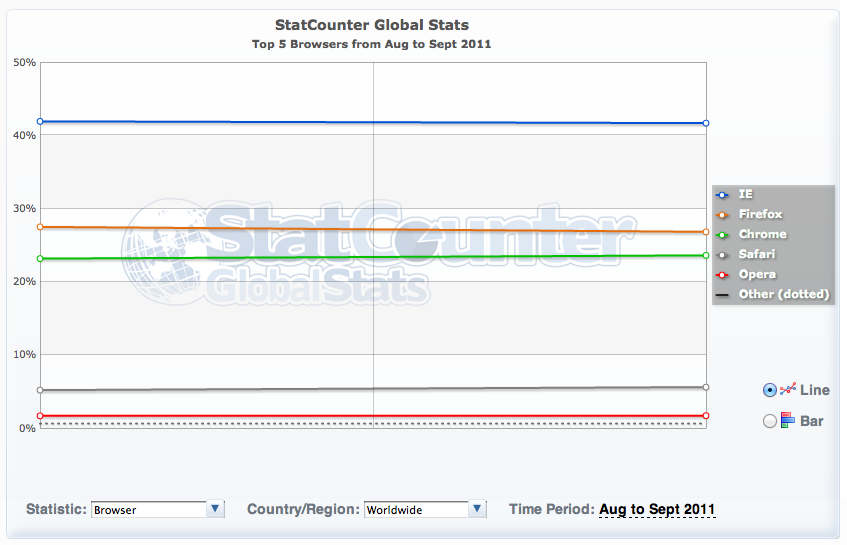 Malgré cela, l’activité utilisatrice de septembre 2011 a été plus tranquille, êtes-vous encore en vacances ? 🙂 Sûrement pas, mais cela prouve juste que les utilisateurs semblent être relativement satisfaits de leur choix de navigateur et se soucient peu du changement. Cela n’est pas surprenant. Les cinq premiers navigateurs qui trônent le podium sont d’excellentes applications et avec très peu de différences fondamentales entre elles.