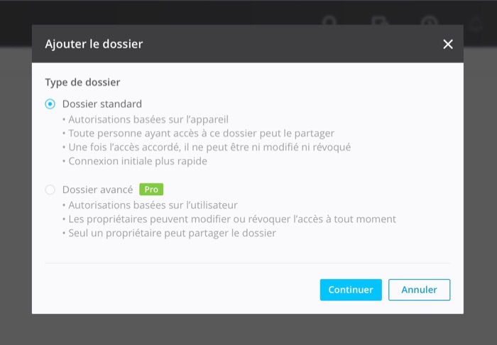 Sous “Autorisation”, vous aurez la possibilité de sélectionner le mode lecture seule ou lecture et écriture. “Lecture seule” signifie que d’autres appareils ne peuvent pas faire les modifications dans ce dossier. Vous choisirez cette option si vous voulez que ce dossier soit le dossier “source”, et que vous voulez que seulement des copies apparaissent sur vos autres appareils.