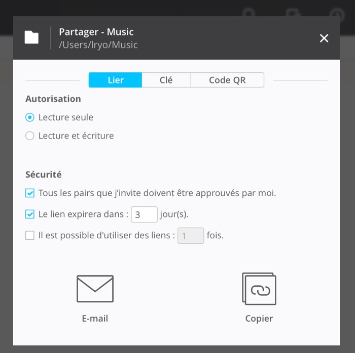 Sous “Sécurité”, vous serez invité à choisir comment vous relier les autres périphériques à ce dossier. L’application va créer un lien Web qu’il est possible d’envoyer par e-mail à d’autres personnes, ou d’utiliser le copier-coller sur d’autres appareils pour les relier rapidement à ce dossier partagé.