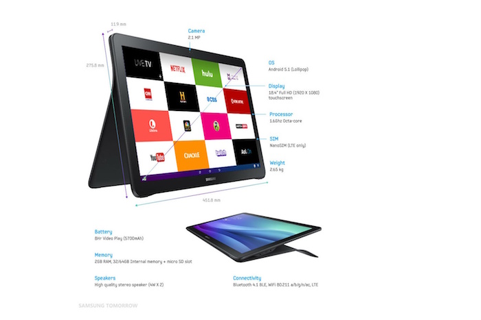 Du côté des spécifications, la Galaxy View dispose d’un écran de 18.4 pouces avec une résolution Full HD, soit 1 920 x 1 080 pixels, d’un processeur octa-core cadencé à 1.6 GHz, de 2 Go de mémoire vive (RAM), de 32 Go ou 64 Go de stockage interne, et un port pour carte micro-SD. Elle dispose également d’une caméra frontale de 2.1 mégapixels, d’une batterie d’une capacité de 5 700 mAh, et d’une connectivité WiFi 802.11ac, du Bluetooth 4.1, et offre un support à la 4G LTE.