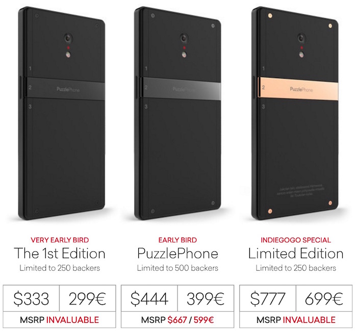 Il existe trois niveaux que les backers de la campagne de financement participatif peuvent choisir. La première offre Very Early Bird. 1st Edition coûte 300 euros, et sera disponible pour 250 personnes. Le châssis sera en plastique moulé noir, et arrivera avec 16 Go de stockage interne. Il est prévu d’arriver en septembre 2016.