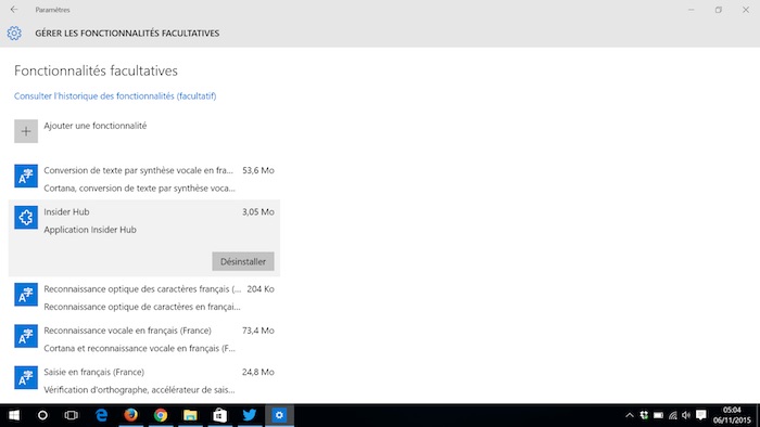 Cependant, cela ne signifie pas que la build 10586 est totalement exempte de bugs. La mise à jour elle-même peut causer la suppression de messages et de contacts de Skype après avoir été retirée de l’application Messagerie. Mais, Microsoft propose une solution à cette problématique sur un article de blog annonçant la mise à jour. Enfin, le Insider Hub peut disparaître une fois la mise à jour terminée. Mais pour le récupérer, il suffit d’aller dans les “Paramètres”, puis “Système” et enfin “Applications et fonctionnalités”. De là, cliquez sur “Gérer les fonctionnalités facultatives”. Sélectionnez “Ajouter une fonctionnalité” ce qui vous permettra de retrouver l’application Insider Hub sur votre système.