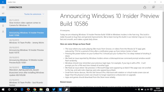 La build numérotée 10586 apporte des correctifs de certaines problématiques mineures, et corrige divers désagréments. Ceci est assez commun pour une version poussée dans le canal Insider. Auparavant, les notifications du centre d’action permettaient de réduire considérablement le volume audio, et les petits périphériques pouvaient avoir un écran bleu lors d’une mise à jour. Heureusement, ces problématiques sont désormais résolues. Le bouton d’alimentation sur la Surface Pro a été à l’origine d’un arrêt complet du périphérique, peu importe les paramètres d’alimentation de l’utilisateur. Maintenant, il va seulement mettre en veille la tablette si l’utilisateur l’a configuré ainsi.