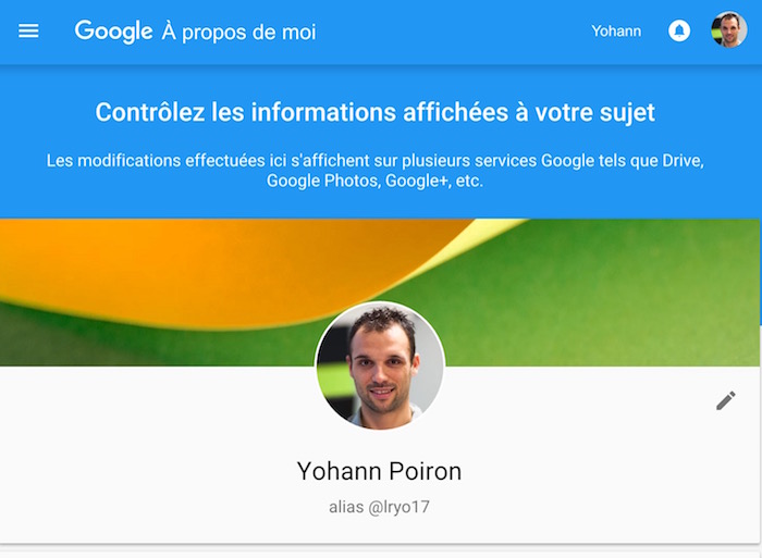 En un mot, la page “À propos de moi” montre toutes les informations qui sont disponibles publiquement sur vous par les différents services de Google. Mais elle fait mieux que cela, puisqu’elle vous permet de les contrôler. Si vous avez un compte Google+, les chances sont que votre nom, votre lieu de travail, et votre image de profil apparaissent en haut, ainsi que toute autre information que vous avez peut-être renseignée au moment de l’inscription.