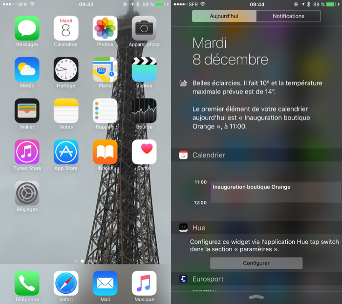 Sans surprise, nous allons retrouver tout ce que l’on aime sur l’écran d’accueil. Rien ne semble avoir changé : le raccourci vers l’appareil photo, l’heure, l’accès au centre de contrôle et au centre de notifications. Mais regardant de plus près, on peut remarquer un subtil changement dans la police utilisée. iOS 9 utilise la police San Francisco par défaut, qui est très différente de la police Helvetica Neue. Est-ce un gros problème ? Non, la différence entre les deux polices de caractères est à peine perceptible.