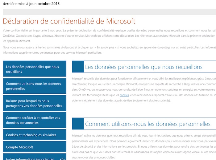 Les changements les plus fondamentaux concernent les passages sur les services et les appareils. Par exemple, le Microsoft Band, les applis Microsoft Health, HealthVault, et d’autres services associés sont désormais réunis en une seule section couvrant tous les projets liés à la santé. Skype a désormais sa propre section, et est réellement un service de Microsoft qui peut recueillir et partager des données personnelles.
