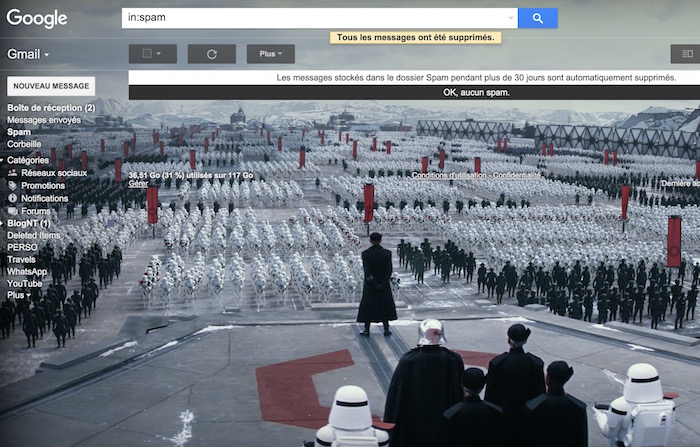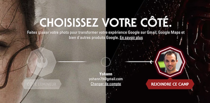 Personnellement j’ai choisi le côté sombre, fournissant à Gmail un nouveau fond, et un sabre laser rouge pour la barre de chargement. Il y a des changements à travers toute la suite d’applications et de services du géant de Mountain View, alors allez vérifier comment votre choix influe sur votre monde en ligne …
