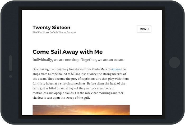 WordPress décrit Twenty Sixteen comme “a modern take on a classic blog design”. Et comme la plupart des thèmes de nos jours, il a été construit pour être visible sur tous les types de périphériques. Cela signifie un design avec une grille fluide, un entête flexible, des couleurs « fun », et ainsi de suite.