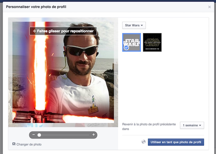 Le compte officiel Facebook de Star Wars a posté un message évoquant la nouvelle option, et mentionnant: “Awaken the Force within by adding Kylo Ren’s lightsaber to your profile picture”. Cependant, si le sabre laser rouge est trop sinistre pour vous, il y a aussi le choix d’opter pour le côté lumineux, matérialisé par un sabre laser de couleur bleue. Il est même possible de définir la date exacte à laquelle vous voulez que votre photo revienne à la normale.
