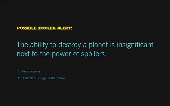 Lorsque vous téléchargez l’extension Force Block pour le navigateur Google Chrome, un écran apparaîtra chaque fois qu’elle détecte quelque chose qui pourrait être un spoiler pour le prochain film. Au cours de mon expérience, elle a censuré beaucoup de choses qui n’étaient certainement pas des spoilers, mais bon, je suppose qu’il vaut mieux être prudent que pas assez durant la période qui précède la sortie du film et jusqu’à ce que vous ayez la chance de le voir par vous-même.