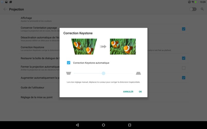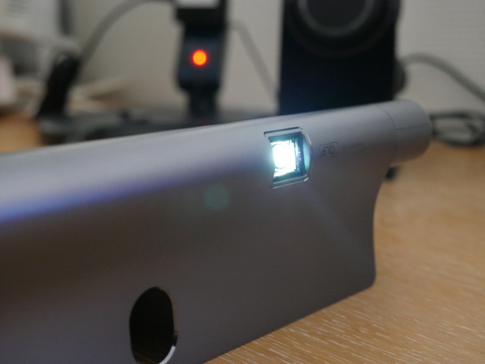 Heureusement, il y a la possibilité de corriger la distorsion trapézoïdale afin que la projection soit toujours à niveau. Bien que j’apprécie le plaisir supplémentaire qu’apporte le pico projecteur, son utilisation va forcément induire d’avoir des conditions d’éclairage au plus bas. Si à la maison essayer de regarder un film dans le noir ne pose aucun problème, il est extrêmement difficile de projeter un diaporama dans une salle de conférence dans le milieu de l’après-midi.
