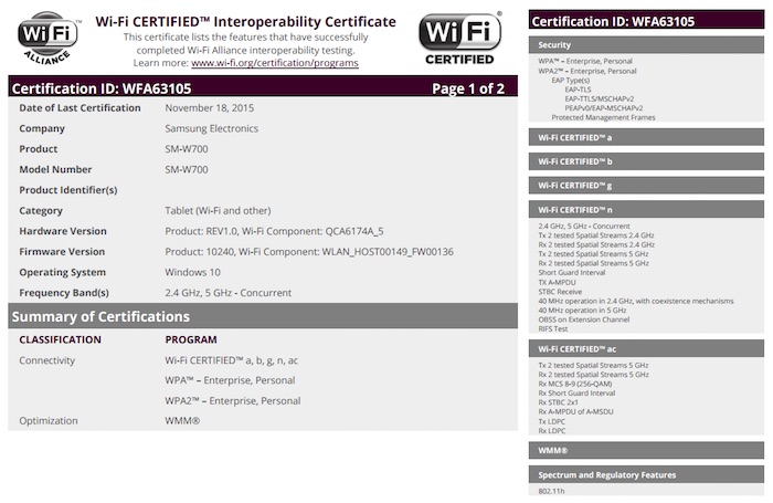 En effet, selon des documents publiés par le Bluetooth SIG and Wi-Fi Alliance, une tablette Samsung sous Windows 10 arriverait peut-être en début d’année 2016. Bien que les détails concrets soient actuellement très rares, la référence SM-W700, apparue sur le site de suivi d’import-export indien Zauba, laisse entendre que le dispositif a été expédié, et qu’il dispose d’un écran de 12 pouces. En outre, il aurait été envoyé en Inde le mois dernier pour des essais, et détruit peu de temps après.