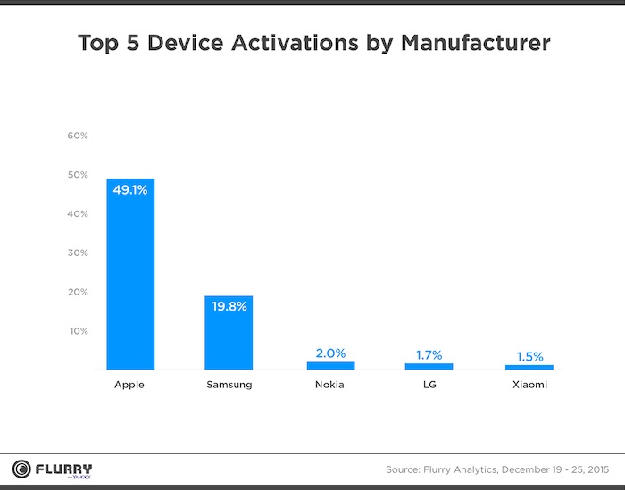 Les smartphones brandés Microsoft étaient déjà une rareté sous l’arbre de Noël en 2014, en enregistrant 5,8 % à cette période, et ont été encore plus rares cette année. Mais, le constructeur n’a pas été le moins performant. Sony a complètement disparu du tableau de Flurry, avec une part de marché de 1,6 % enregistrée l’année dernière, avant de complètement disparaître en 2015. Au lieu de cela, la marque chinoise Xiaomi a volé sa part de marché, recueillant 1,5 % des activations sur la période. Cela prouve l’influence croissante de Xiaomi, étant donné qu’il est seulement vendu dans certaines parties de l’Asie, où Noël n’est pas la période où l’on offre le plus de cadeaux.