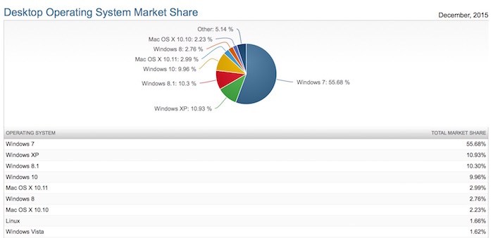 En décembre 2015, Windows 10 représenterait 9,96 % du marché mondial du système d’exploitation de bureau, selon Net Applications. Comme depuis de très longs mois maintenant, Windows 7 reste largement en tête de ce marché avec 55,68 % de parts de marché, suivi par l’infatigable Windows XP, et ses 10,93 % de parts de marché. Enfin, Windows 8.1 complète ce podium avec une part de marché de 10,30 %. Mac OS X 10.11 a 2,99 % du marché.