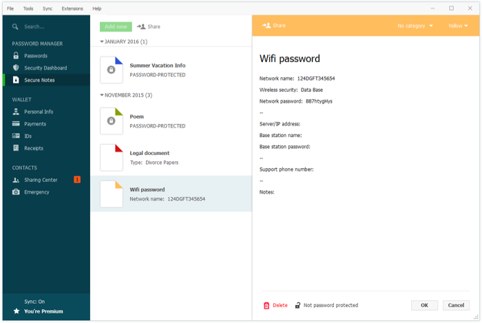 Les sections Mots de passe, Notes, Données personnelles, Pièces d’identité, et Reçus ont été retravaillées, vous permettant de disposer d’une vue en liste ou sous forme de mosaïque, et de diverses autres options de tri, etc. Le but est de mieux manipuler vos données dans Dashlane. De plus, vous allez disposer de huit nouveaux formats prédéfinis de Notes sécurisées, afin de gérer vos documents financiers, documents juridiques, vos mots de passe Wi-Fi, etc. Le but est d’avoir un « coffre-fort » sur votre ordinateur, et partout où vous aller.