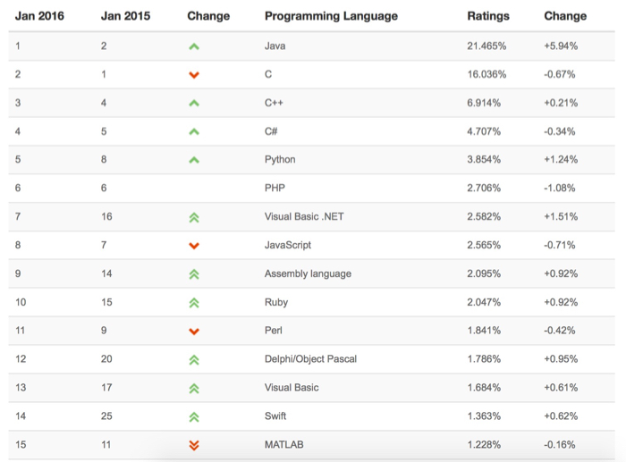 Comme chaque année, le mois de janvier est riche en chiffres, et nous donne la tendance de l’année passée dans différents domaines. Comme vous l’aurez compris, Java a été le langage de programmation le plus populaire de l’indice de TIOBE en 2015. D’ailleurs, cela ne faisait quasiment aucun doute à tel point il dominait le secteur. Java a été au sommet de la liste durant une longue période, et en 2015, il a augmenté de 6% par rapport aux autres langages, grignotant donc quelques parts – Visual Basic .NET à 2% et Python à 1%.