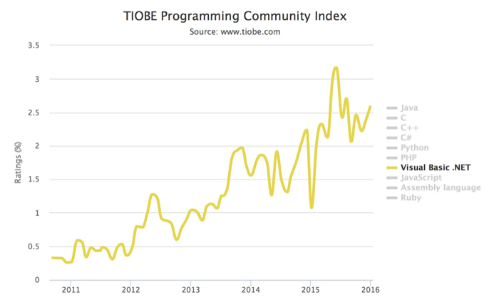 Ensuite, il y a Visual Basic .NET qui fait une entrée fracassante. Pourquoi retrouve-t-on un intérêt dans un langage qui est éclipsé par C# ? Ce dernier a réussi à séduire, car il s’avère être un langage facile à utiliser tout en restant moderne. Mais, ce n’est pas une opinion largement partagée. Si Visual Basic .NET est revenu sur les talons de C#, je doute que beaucoup de développeurs le prennent en considération lors de la création d’un nouveau projet. Je trouve que la position de Visual Basic .NET à la 7e place, contre 16 il y a un an, est probablement un artefact de la façon dont l’indice est calculé.