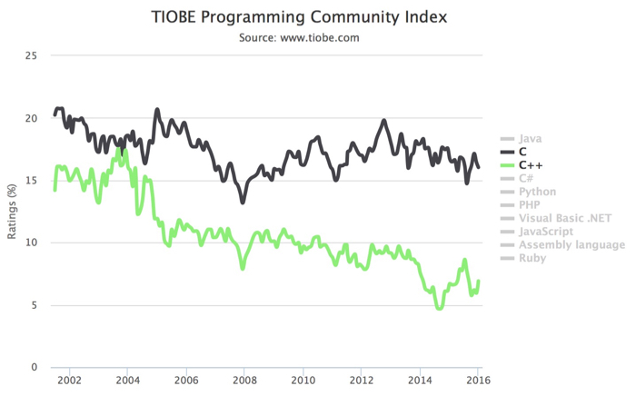 Parmi les autres langages, le C est passé en seconde position, tandis que le C++ a gagné une place, passant sur la troisième marche du podium – confirmant l’idée que si vous regroupez le C et le C++, ces derniers dépasseraient Java. Pendant ce temps, C# grimpe à la 4e place, ce qui reste raisonnable.