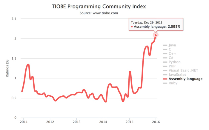 Les autres changements notables concernant les langages d’assembleur, tels que Ruby, Delphi, Pascal ou encore Groovy. Je me demande si l’éclosion du Raspberry Pi n’a rien à voir avec la popularité de ces langages.