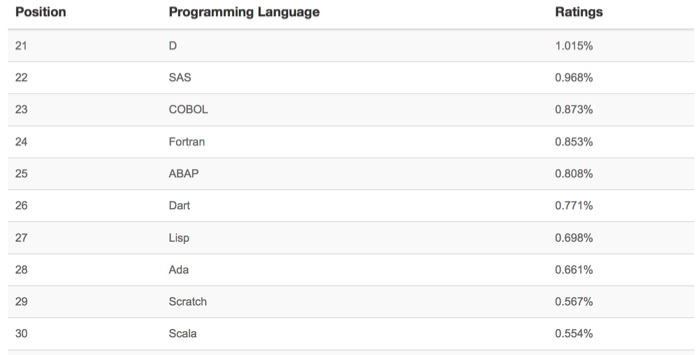 Enfin juste pour nous rappeler que les anciens langages de programmation ne meurent jamais. Cobol et Fortran sont à la 23e et la 24e place. Rappelons-nous de la citation de Tony Hoare en 1984 : “je ne sais pas à quoi va ressembler le langage de l’an 2000, mais je sais qu’il sera nommé Fortran”.