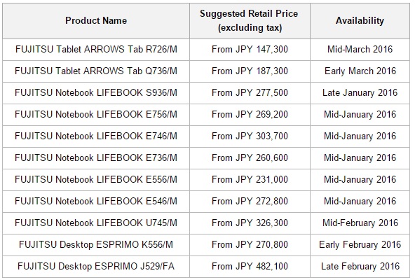 Les ordinateurs portables LifeBook vont commencer à être commercialisés à compter de ce mois, le Esprimo arrivera le mois prochain, et la tablette et les hybrides Arrows arriveront au mois de mars.