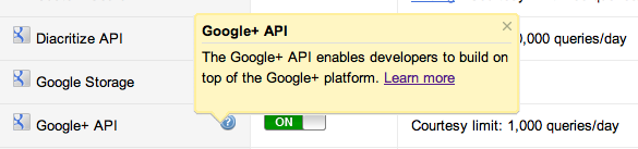 Vous devez également obtenir la clé API de Google+. Pour résumer il suffit d’aller sur la console API, puis l’onglet “Services” et switcher à “On” l’API Google+.